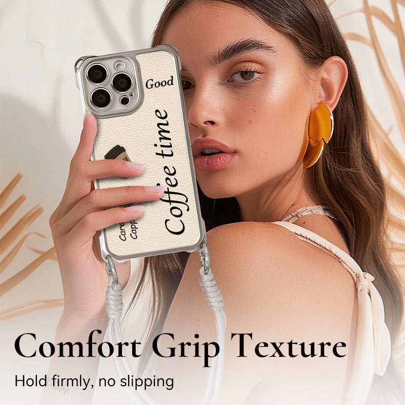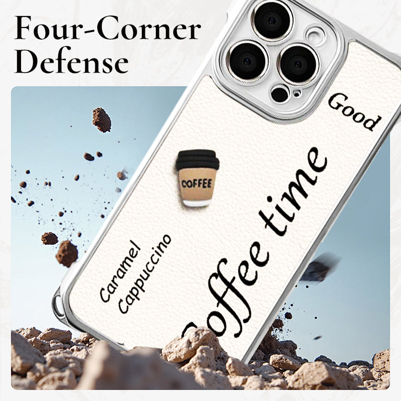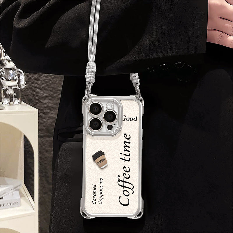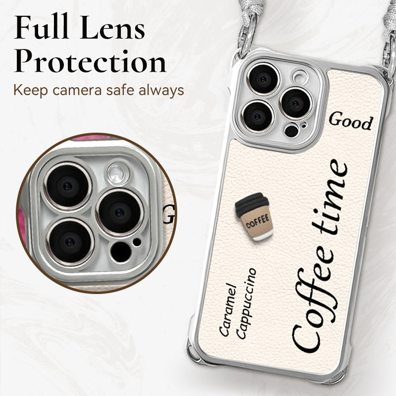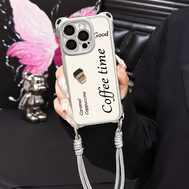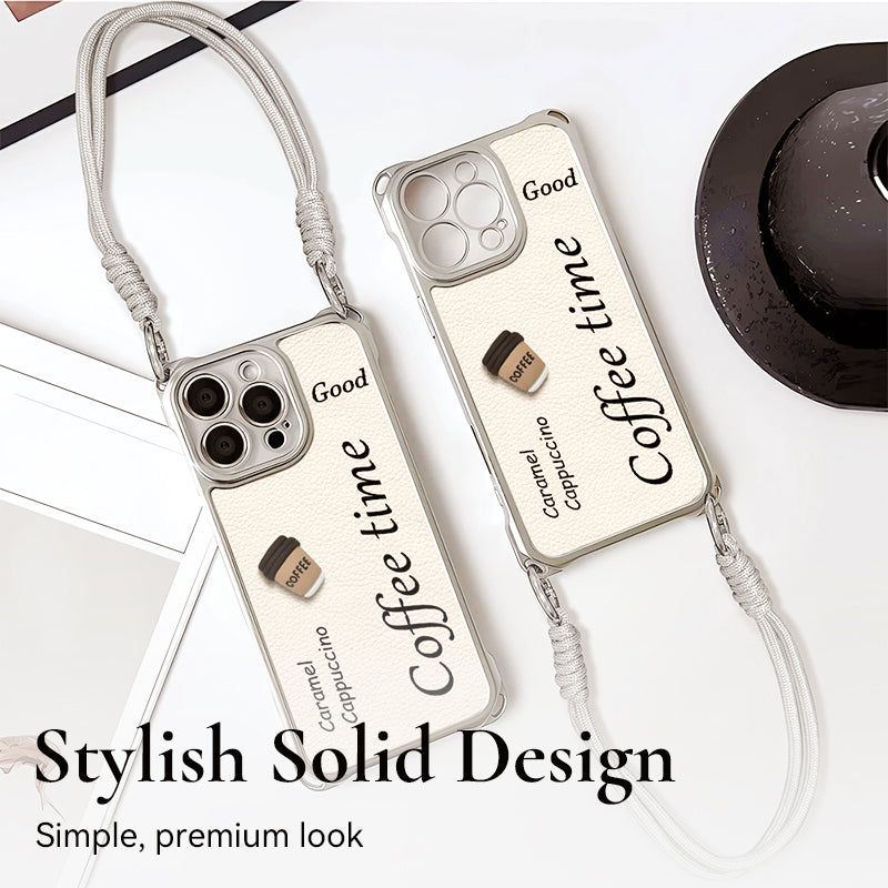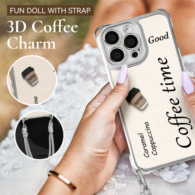 FUN 3D COFFEE DOLL & STRAP – The standout detail is the adorable 3D coffee doll with a matching strap. Beyond playful decoration, the strap adds convenience for carrying, reducing the chances of dropping your phone. This unique feature combines fun with function, making it a lifestyle accessory as well as a protective case.