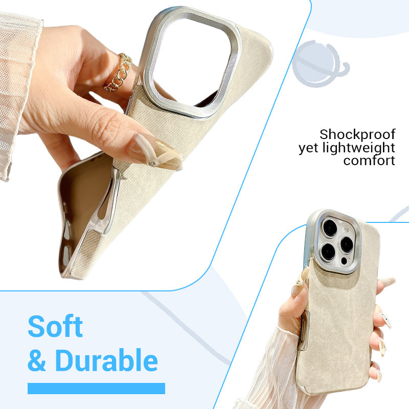 Materials: Flexible TPU with electroplated finish and denim-textured surface.